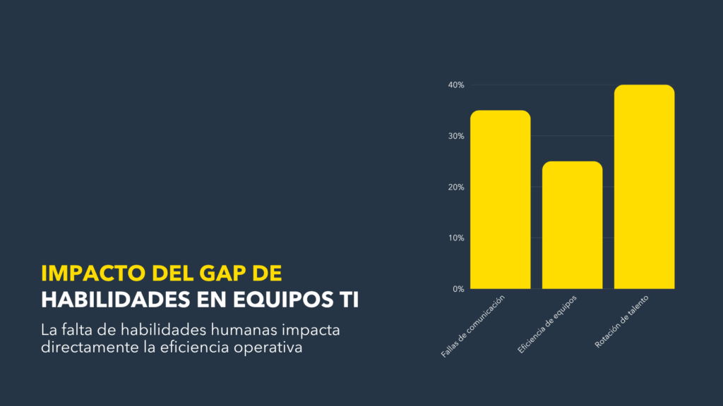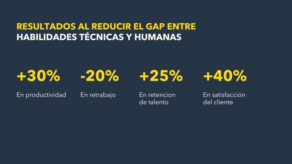 Esto genera un problema crítico: el gap entre habilidades técnicas y humanas, que afecta la productividad, la comunicación y la retención de talento.