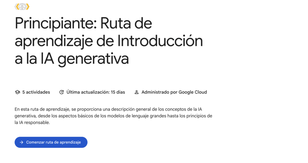 Google tiene cursos gratuitos que cubren Machine Learning, IA aplicada y herramientas de Google Cloud. Aprende a tu ritmo con materiales oficiales y prácticos.